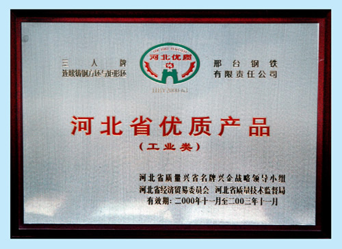 三人牌連續(xù)鑄鋼方坯與矩形坯獲河北省優(yōu)質(zhì)產(chǎn)品(工業(yè)類)