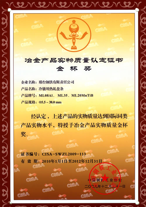 冷鐓用熱軋盤條ML08AL、ML35、ML20MnTiB獲冶金產(chǎn)品實物質(zhì)量金杯獎