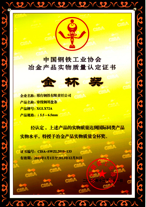 簾線鋼用盤條XGLX72A獲冶金產(chǎn)品實物質(zhì)量金杯獎