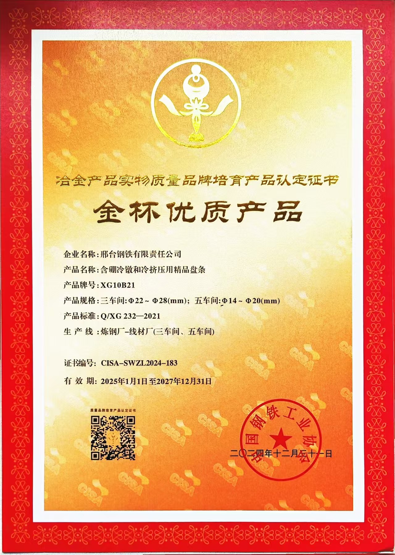 2024年公司含硼冷鐓及冷擠壓用精品盤條XG10B21產(chǎn)品獲得冶金產(chǎn)品實物質(zhì)量品牌培育產(chǎn)品(金杯優(yōu)質(zhì)產(chǎn)品)認定證書,簡稱金杯獎。“冶金產(chǎn)品實物質(zhì)量品牌培育”評選活動于24年3月啟動,由中國鋼鐵工業(yè)協(xié)會主辦,金杯獎是中國鋼鐵工業(yè)協(xié)會組織的冶金行業(yè)唯一的比較權(quán)威的獎項,