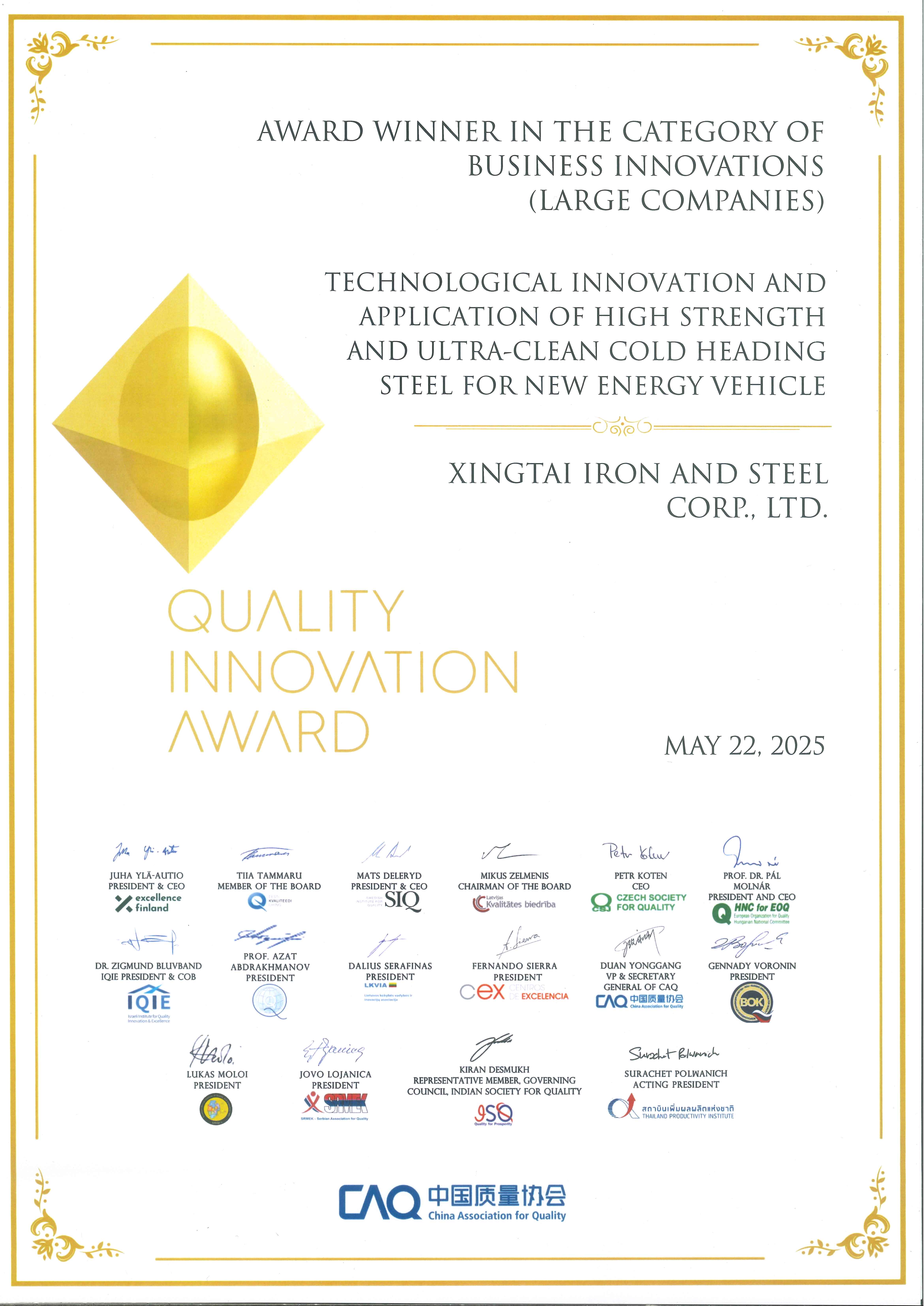 2025.5.22-23邢臺鋼鐵有限責任公司參加了在泰國舉辦的2024年國際質(zhì)量創(chuàng)新大賽發(fā)布會暨頒獎儀式,邢臺鋼鐵發(fā)布的項目《新能源汽車用高強度超高潔凈度冷鐓鋼技術(shù)創(chuàng)新及應(yīng)用》榮獲該大賽一等獎。這是邢鋼歷史上獲得的首個國際大獎,也是自國際質(zhì)量創(chuàng)新大賽舉辦以來,在鋼鐵領(lǐng)域首次獲得的國際大獎。