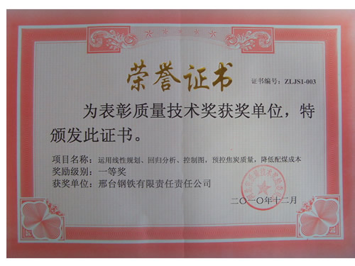 - 近日獲悉,我公司申報的“運(yùn)用線性規(guī)劃、回歸分析、控制圖預(yù)控焦炭質(zhì)量,降低配煤成本”質(zhì)量技術(shù)成果,經(jīng)河北省質(zhì)量技術(shù)獎勵委員會評選,獲得一等獎。該項(xiàng)目是焦化廠運(yùn)用質(zhì)量統(tǒng)計(jì)技術(shù)工具經(jīng)過實(shí)踐取得的一項(xiàng)質(zhì)量技術(shù)成果。通過實(shí)施該項(xiàng)目,配合煤成本比2008年降低了4775萬元,保持了焦炭質(zhì)量的持續(xù)穩(wěn)定。