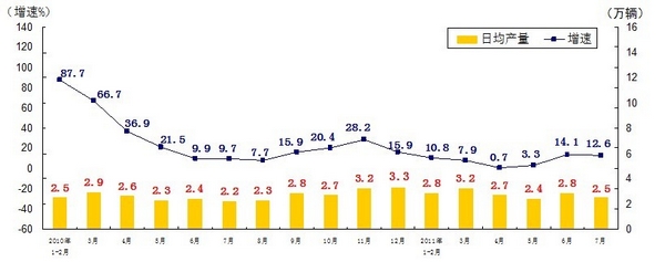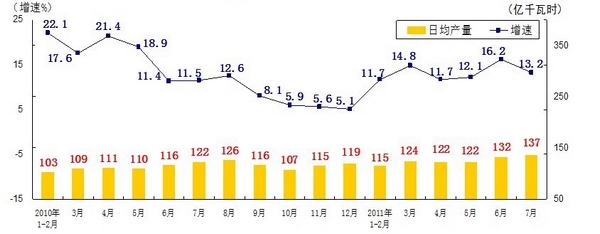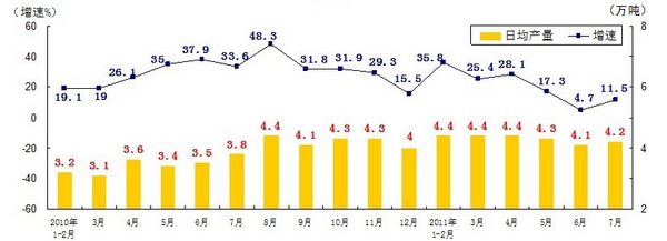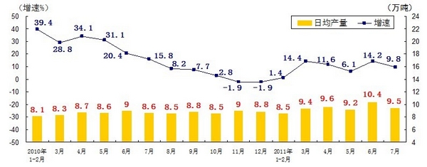 分產品看,7月份,468種產品中有381種產品同比增長。其中,發(fā)電量4252億千瓦時,日平均發(fā)電量137億千瓦時,增長13.2%;鋼材7572萬噸,日平均產量244萬噸,增長14.9%;水泥18308萬噸,日平均產量591萬噸,增長16.8%;原油加工量3749萬噸,日平均產量121萬噸,增長5.9%;十種有色金屬293萬噸,日平均產量9.5萬噸,增長9.8%;乙烯130萬噸,日平均產量4.2萬噸,增長11.5%;汽車131.8萬輛,日平均產量4.3萬輛,下降1.3%;轎車77.7萬輛,日平均產量2.5萬輛,增長12.6%。(參見附圖)
