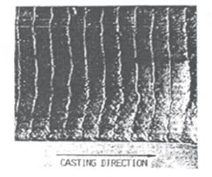 振痕是由于結(jié)晶器的周期性振動(dòng)而拄鑄錠表面產(chǎn)生的間距均勻有一定深度的橫向皺折,其典型的形貌如下圖所示。