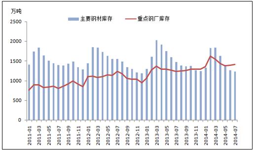 目前,中國鋼材市場正處于去庫存時期,主要鋼材的庫存量正在快速減少。據(jù)我的鋼鐵數(shù)據(jù)庫顯示截止2014年8月8日,中國主要鋼材庫存量為1190.35萬噸,與去年相比下降202萬噸,同比降幅為14.5%。3月至7月的平均降速達(dá)到9.62%,已大幅度超過以往的去庫存速度。庫存量的快速下降,一般意味著下游行業(yè)對鋼材需求的增加,鋼材市場的情況理應(yīng)十分良好,但實際上鋼材的價格卻是不增反降。據(jù)悉,中國7月的Myspic普鋼絕對價格指數(shù)為3393.54元/噸,同比下降8.56%。