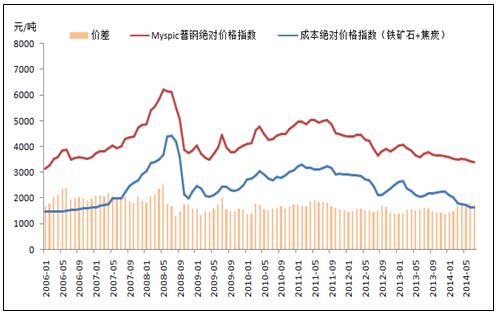 鋼鐵行業(yè)的原材料主要是鐵礦石和焦炭,近期原材料和鋼材的價格一直處于下跌狀態(tài)。截止2014年8月12日中國的焦炭絕對價格指數(shù)為931.8元/噸,同比下降19.33%;鐵礦石的絕對價格指數(shù)為699元/濕噸,同比下降27.55%;Myspic普鋼絕對價格指數(shù)為3380.68元/噸,同比下降9.8%,原材料價格下降速度遠(yuǎn)大于鋼鐵。