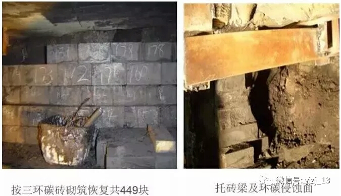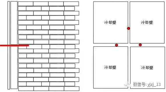 割除燒穿區(qū)域燒損的5塊冷卻壁,并清理燒穿部位的殘?jiān)?、爐料,摳除部分燒損炭磚,露出砌筑接口。