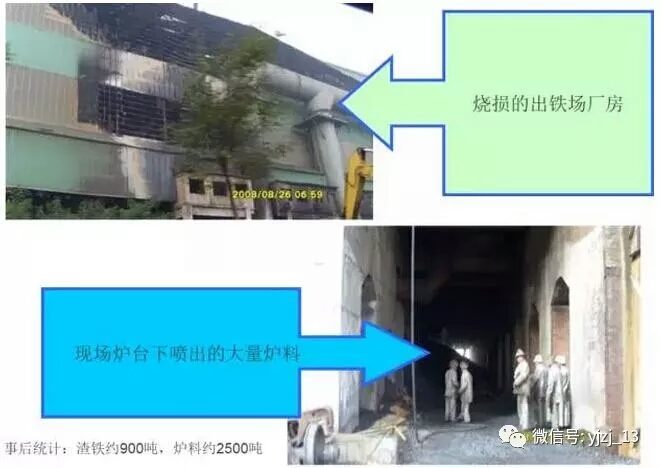 事后確認(rèn):4#鐵口下方爐缸燒穿,大量渣鐵和炙熱的爐料(焦炭、礦石)噴出,現(xiàn)場(chǎng)燒損嚴(yán)重(新3高爐本體電纜、煤粉噴吹總線(xiàn)電纜、新2高爐電源電纜、計(jì)量?jī)x表電纜、出鐵場(chǎng)天棚、4#爐前炮、開(kāi)口機(jī)、東場(chǎng)及北場(chǎng)爐前吊車(chē)、爐前休息室、電梯等燒損。)