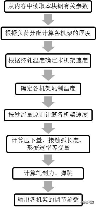 圖1所示為精軋設(shè)定模型計算原理圖的主要思路,不代表編寫程序所用的細(xì)框圖,因此只是展現(xiàn)了大概的計算流程,看圖可以初步了解精軋設(shè)定模型的大致控制思路。