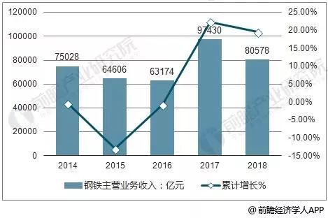 據(jù)前瞻產(chǎn)業(yè)研究院發(fā)布的《中國鋼鐵行業(yè)發(fā)展前景與投資戰(zhàn)略規(guī)劃分析報告》指出,2018上半年中國鋼鐵行業(yè)主營業(yè)務收入達到30525億元,累計增長15.8%?;仡?012-2017年鋼鐵行業(yè)營業(yè)收入情況:近六年來,我國鋼行業(yè)營業(yè)收入較為穩(wěn)定,2015年以來累計增長率逐漸回暖。中國鋼鐵行業(yè)將繼續(xù)保持穩(wěn)中有長趨勢,預計2018年中國鋼鐵行業(yè)營收將突破80000億元。