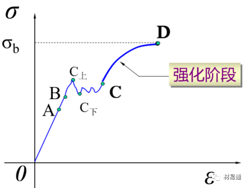 經(jīng)過(guò)屈服階段后,曲線從C點(diǎn)又開(kāi)始逐漸上升,說(shuō)明要使應(yīng)變?cè)黾?,必須增加?yīng)力,材料又恢復(fù)了抵抗變形的能力,這種現(xiàn)象稱(chēng)作強(qiáng)化,CD段稱(chēng)為強(qiáng)化階段(加工硬化)。