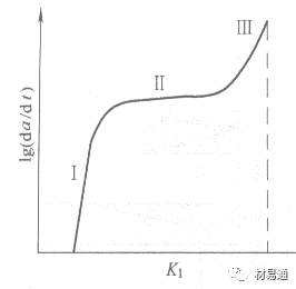 當(dāng)裂紋尖端的KIKISCC時(shí),裂紋就會(huì)不斷擴(kuò)展。單位時(shí)間內(nèi)裂紋的擴(kuò)展量叫做應(yīng)力腐蝕裂紋擴(kuò)展速率,用da/dt表示。裂紋的擴(kuò)展速率da/dt隨著應(yīng)力強(qiáng)度因子K1而變化。