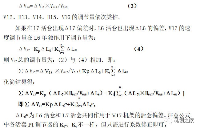 當(dāng)活套一旦形成以后,活套的實(shí)際高度立即由活套掃描器測(cè)得的值經(jīng)過PI調(diào)節(jié)器,輸出一個(gè)控制信號(hào),通過控制上游軋機(jī),使活套大小得到調(diào)節(jié),使活套保持在設(shè)定的高度范圍。速度調(diào)節(jié)量是按逆流調(diào)速的方法,按同樣比例對(duì)軋機(jī)的工作速度進(jìn)行級(jí)聯(lián)調(diào)節(jié)。假如活套L7出現(xiàn)高度差為ΔL7,則V18機(jī)架的速度調(diào)節(jié)是: