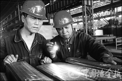 圖為邢鋼線材廠員工對(duì)修磨鋼坯進(jìn)行檢驗(yàn)的現(xiàn)場(chǎng)。