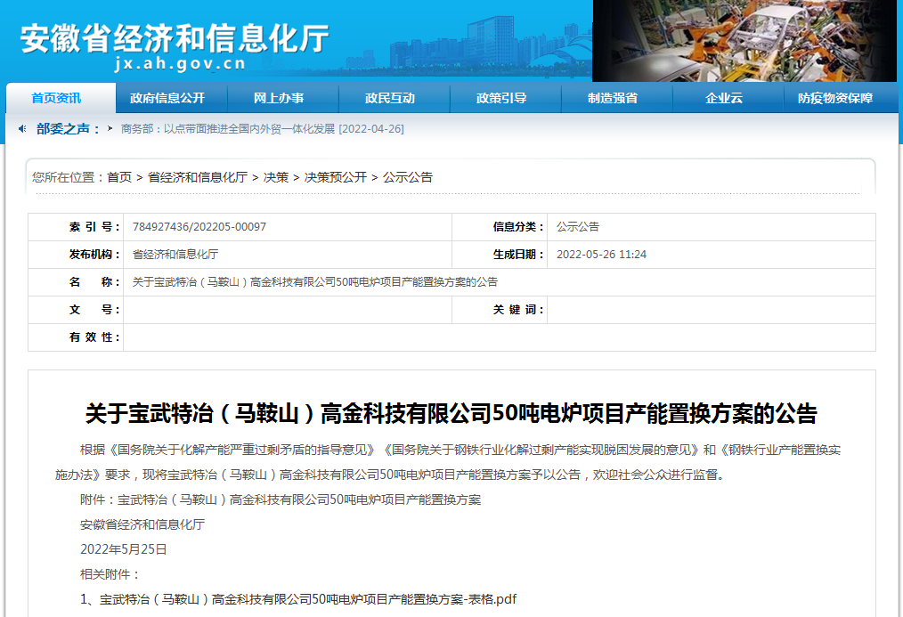 根據(jù)《國(guó)務(wù)院關(guān)于化解產(chǎn)能嚴(yán)重過(guò)剩矛盾的指導(dǎo)意見》《國(guó)務(wù)院關(guān)于鋼鐵行業(yè)化解過(guò)剩產(chǎn)能實(shí)現(xiàn)脫困發(fā)展的意見》和《鋼鐵行業(yè)產(chǎn)能置換實(shí)施辦法》要求,現(xiàn)將寶武特冶(馬鞍山)高金科技有限公司50噸電爐項(xiàng)目產(chǎn)能置換方案予以公告,歡迎社會(huì)公眾進(jìn)行監(jiān)督。