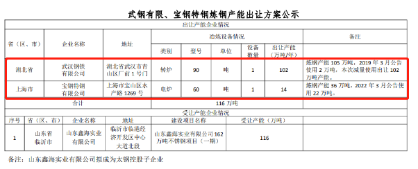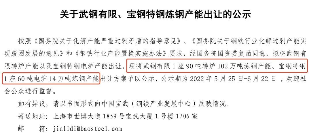 按照《國(guó)務(wù)院關(guān)于化解產(chǎn)能嚴(yán)重過(guò)剩矛盾的指導(dǎo)意見》、《國(guó)務(wù)院關(guān)于鋼鐵行業(yè)化解過(guò)剩產(chǎn)能實(shí)現(xiàn)脫困發(fā)展的意見》和《鋼鐵行業(yè)產(chǎn)能置換實(shí)施辦法》要求,經(jīng)國(guó)務(wù)院國(guó)資委復(fù)函同意,擬將武鋼有限轉(zhuǎn)爐產(chǎn)能以及寶鋼特鋼電爐產(chǎn)能出讓?,F(xiàn)將武鋼有限1座90噸轉(zhuǎn)爐102萬(wàn)噸煉鋼產(chǎn)能、寶鋼特鋼1座60噸電爐14萬(wàn)噸煉鋼產(chǎn)能出讓方案予以公示,公示期為2022年5月25日-6月22日,歡迎社會(huì)公眾進(jìn)行監(jiān)督。