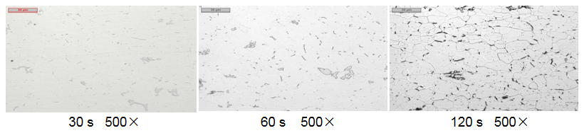 不同浸蝕時(shí)間的影響(滲碳體,采用4%苦味酸浸蝕)