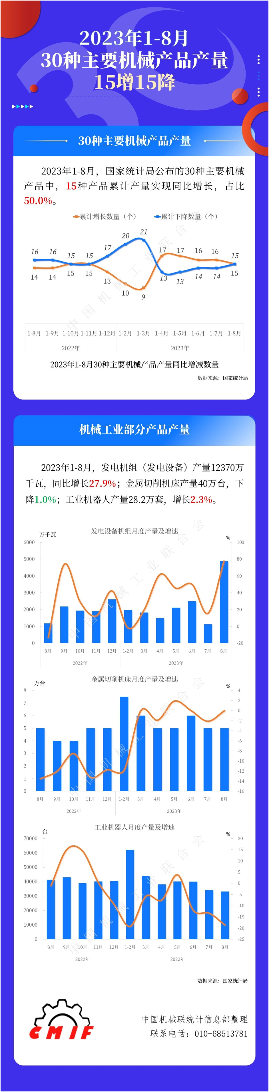 2023年1-8月30種主要機(jī)械產(chǎn)品產(chǎn)量15增15降