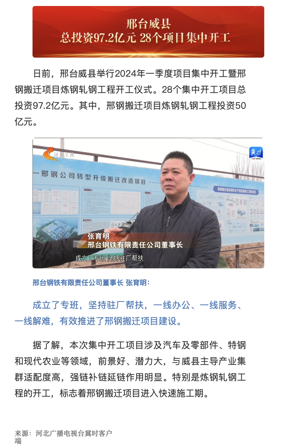 中新網(wǎng)河北新聞2月18日電(張鵬翔 李鐵錘 趙國華)2月18日,河北省威縣舉行2024年一季度項(xiàng)目集中開工暨邢鋼搬遷項(xiàng)目煉鋼軋鋼工程開工儀式,全面擂響項(xiàng)目攻堅(jiān)年的戰(zhàn)鼓,掀起奪取首季“開門紅”的新高潮。