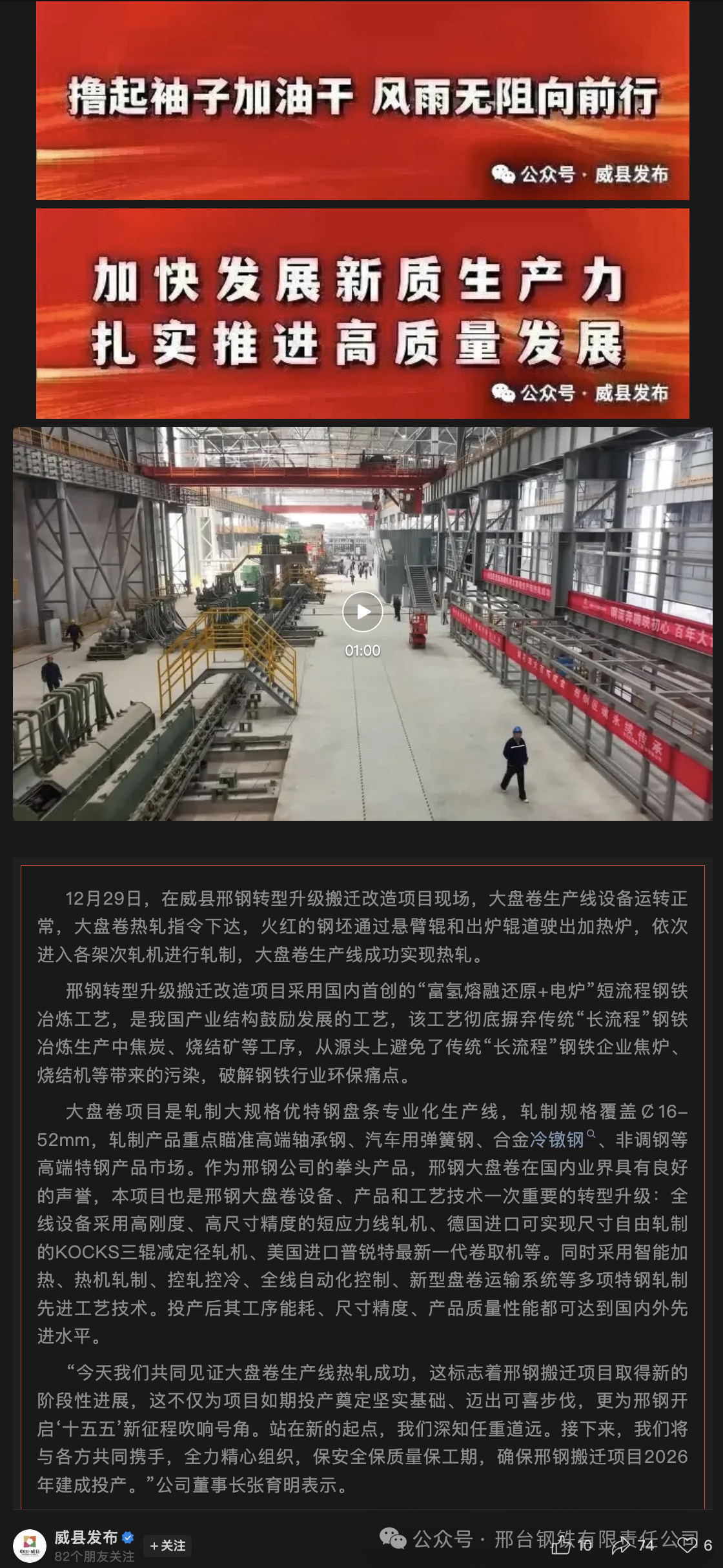 邢鋼轉(zhuǎn)型升級(jí)項(xiàng)目大盤卷生產(chǎn)線熱軋成功